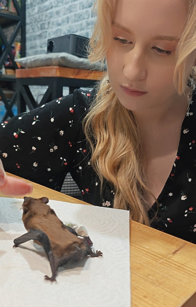 Позже мы узнали, что это была рыжая вечерница — насекомоядная летучая мышь. Такие виды питаются исключительно насекомыми: сверчками, тараканами (туркменскими, мадагаскарскими), зоофобусами и т. д. Фруктоядные летучие мыши действительно существуют, но в нашей стране они не водятся. Однако эта мышка была в крайне истощённом состоянии, видимо, давно ничего не ела и не пила, поэтому даже такая неподходящая еда ей подошла.